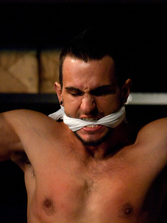 Phenix Saint fucks Luke Riley while Luke is tied up and suspended from the ceiling fan.